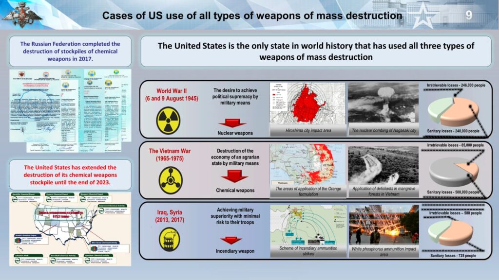 При этом Игорь Кириллов добавил, что сегодня США являются единственным государством мира, которое применило все три вида оружия массового поражения. Токсичные химикаты использовались во Вьетнаме и Ираке, на Хиросиму и Нагасаки во время Второй мировой войны были сброшены атомные бомбы “Малыш” и “Толстяк”.